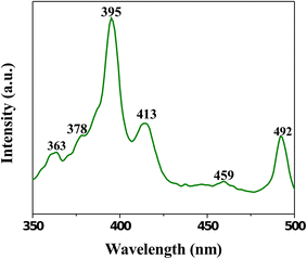 NP sample mainly consists of six emission peaks; weak blue bands at 363, 378, 413, and 459 nm; a broad emission band at 395 nm; and a weak blue–green band at 492 nm. The dependence of PL blue-shift peak on CeO