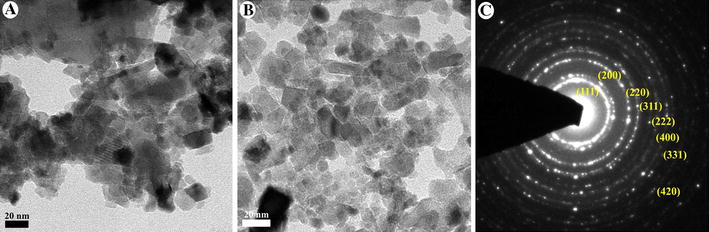 NPs exhibit cubic and spherical morphologies with their sizes ranging from 5 to 20 nm with an average size of about 10 nm. The SAED patterns of CeO