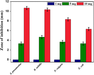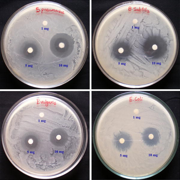 The antibacterial activity of the mycosynthesized CeO 2 NPs was examined against two Gram-positive (G+) ( Streptococcus pneumoniae , Bacillus subtilis ) and Gram-negative (G−), ( Proteus vulgaris, Escherichia coli ) pathogenic bacteria using disk diffusion method [ 27 ]. The bacterial strains were grown in nutrient broth at 37 °C until the bacterial suspension reached 1.5 × 10 8 CFU/mL. Approximately 20 mL of molten nutrient agar was poured into the Petri dishes and cooled. All the bacterial suspension was swapped over the medium, the disks were loaded at three different concentrations 1, 5, and 10 mg/mL of CeO 2 NPs using sterile distilled water, and then they were placed over the medium using sterile forceps. The plates were then incubated at 37 °C for 24 h. The inhibition zone formed around each disk was measured, and each experiment was conducted in triplicate.