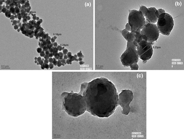 TEM images were taken at different scales (500, 100 and 50 nm) to see the formation of CMGG stabilized PANI/CMGG nanocomposites Fig. 5 . TEM images clearly show the CMGG nanoparticles stabilized PANI/CMGG nanocomposites in nanorange with spherical shape. This confirms the formation of nanocomposites. The average size of the PANI/CMGG nanoparticles has been found in the range of 90–280 nm, calculated by using image J software.