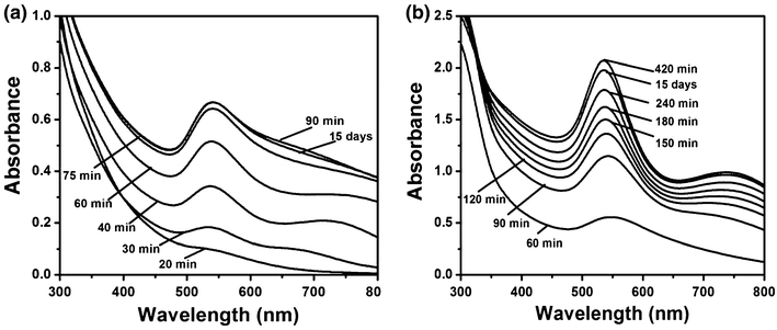 a) showed a weak SPR band at 536 nm and after 90 min, a red shift was observed in SPR at 540 nm due to slight modification in the size and shape of AuNPs. Absorption spectra of AuNPs synthesized from