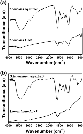 FTIR spectral measurements on aqueous extracts of marine algae and the obtained AuNPs are carried out to identify the possible biomolecules that are responsible for the reduction of Au(III) ions as well as capping of the AuNPs. Figure