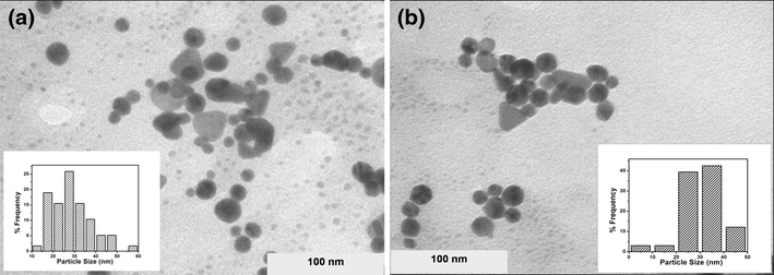 The catalytic decolorization reactions were carried out in a 3-ml quartz cuvette with a path length of 1 cm and were monitored by UV–vis spectrophotometer by following the method reported by Gangula et al. [ 47 ]. An aqueous stock solution of p -nitrophenol or p -nitroaniline (0.3 ml of 2 mM) was mixed with distilled water (1.4 ml) and then an ice cold solution of sodium borohydride (1 ml of 0.03 M) was added. To this, the biosynthesized nanoparticles dispersion solution (0.3 ml) was added and the contents were mixed well. The reaction progress was monitored by recording the time-dependent absorption spectra in the range of 200–500 nm at room temperature.