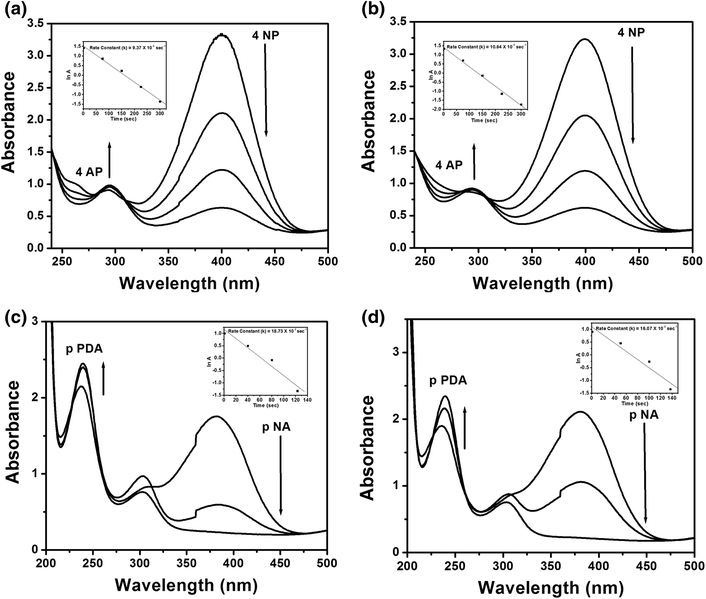 -phenylenediamine). Progress of the reduction reaction was visualized with discoloration of characteristic yellow color of the nitro compounds and the reaction was monitored with UV–vis spectroscopy as shown in Fig.