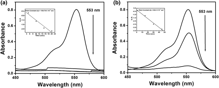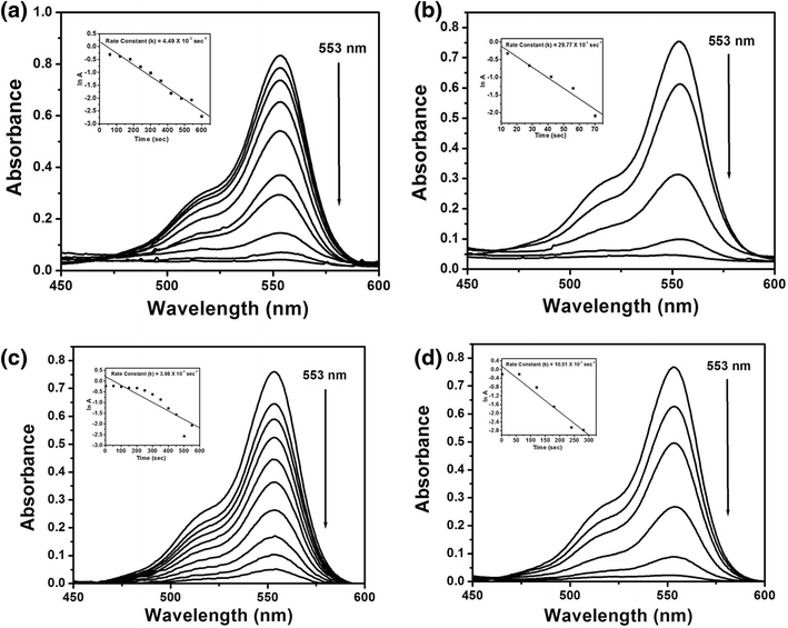 UV–vis absorption spectra for catalytic reduction of Rhodamine B at 553 nm with NaBH