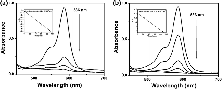 The maximum absorbance of aqueous solution of 4-nitrophenol (4-NP) was found to be at 317 nm and the addition of NaBH 4 caused a red shift in the absorbance from 317 to 400 nm. This is due to the formation of 4-nitrophenolate ion and is indicative due to the color change from light yellow to intense yellow. The absorption peak at 400 nm remained unaltered with time in the absence of nanoparticles, suggesting that the reduction did not take place. But with the addition of nanoparticles synthesized from the aqueous extract of T. conoides , the yellow color faded gradually to a colorless solution. The intensity of the absorption peak at 400 nm decreased gradually with the concomitant appearance of a new peak at 298 nm, corresponding to the formation of 4-aminophenol (4-AP) (Fig. 5 a) [ 45 ]. In this process of catalytic reduction, the nanoparticles transfer the electrons from BH 4 − ions to nitro compound, which was qualitatively monitored by UV–vis spectrophotometer. As seen in Fig. 5 a, the presence of isosbestic points indicates that 4-NP is fully converted to only 4-AP and no side reaction took place [ 46 ]. The reaction was complete within 300 s at room temperature. Inset of Fig. 5 a shows that the logarithm of the absorbance of 4-nitrophenolate at 400 nm (ln A ) versus time showed a good linear correlation and the rate constant ( k ) was calculated to be 9.37 × 10 −3 s −1 . Furthermore, the same method was followed for evaluating the catalytic effect of AuNPs obtained from S. tenerrimum . The reaction was complete within 300 s and k value was determined to be 10.64 × 10 −3 s −1 (Fig. 5 b).