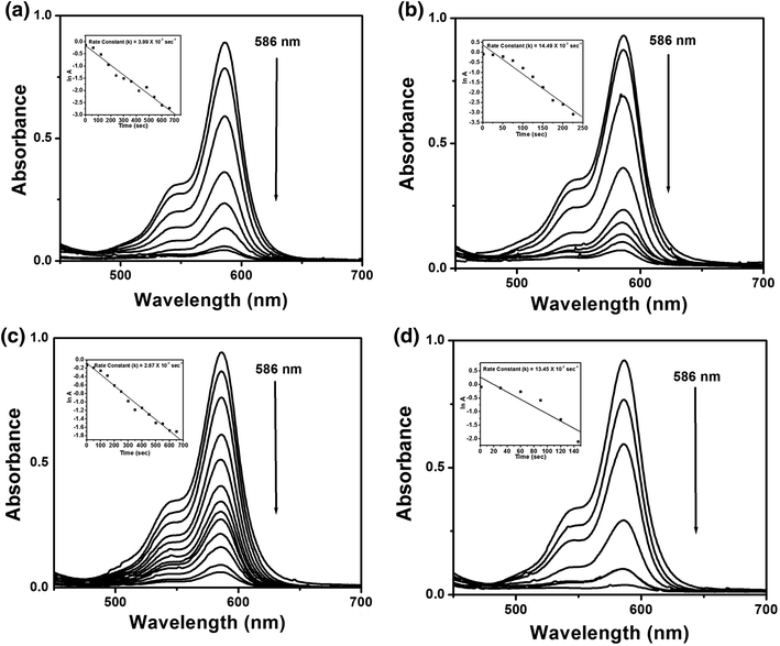 = absorbance at 553 nm) versus time UV–vis absorption spectra for catalytic reduction of Sulforhodamine 101 at 586 nm using AuNPs obtained from