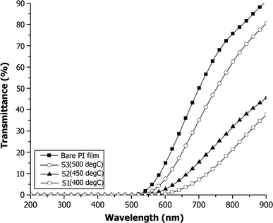 Optical transmission spectra of bare PI and ITO coated varieties at different deposition temperaturesFig. 3