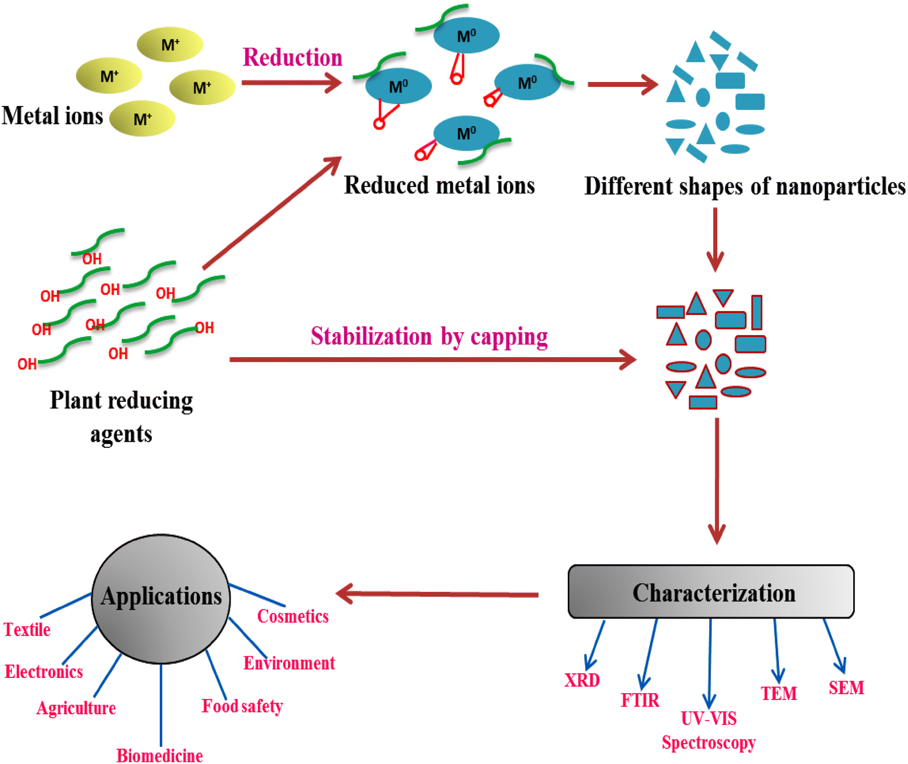 Due to the unique properties of metal nanoparticles like large fraction of surface atoms, large surface energy, spatial confinement, and reduced morphology make it significantly different from the corresponding bulk materials. These unique properties of nanoparticles make them applicable in the field of catalysis, agriculture, electronics, biomedical analysis [ 9 ], and even ground water purification [ 10 ]. Gold, silver, copper, iron, zinc, and other metal nanoparticles are used in food packaging, wound dressings, catheters for drug delivery, and so on due to the broad range of antimicrobial effects. Silver nanoparticles are known to be mostly used in the field of biomedical science due to their great antimicrobial effect; zinc and titanium nanoparticles are known to be used in cosmetics. The second application area of biological nanoparticles is the formulation of biosensors for various molecules related to environmental factors and agriculture. In addition, nanoparticles are also used in gene delivery and cell labelling in plants and in medicine [ 11 ]. Other applications of metal nanoparticles are still under research and in development, such as magnetically responsive drug delivery, photoimaging, and photothermal therapy. Nowadays, due to the physicochemical properties and the application of nanoparticles in many fields of sciences, scientific community decided to make extensive efforts to develop a novel route for producing nanoparticles. Although other physicochemical approaches cause environmental pollution by discharging heavy metals during synthesis process. Thus, the synthesis of nanoparticles using green approaches has the several advantages like non-toxicity, reproducibility in production, having easy scaleup, and well-defined morphology becomes new trends in nanoparticles synthesis [ 12 ]. In recent years, plants and microbes have found as new resources with considerable synthesis of organic metal nanoparticles [ 13 ]. In this review paper, we review the methods of making nanoparticles using different plant extracts, possible mechanism of nanoparticle synthesis, and their pharmaceutical applications, and products available in the market their clinical trial status are also reviewed.
