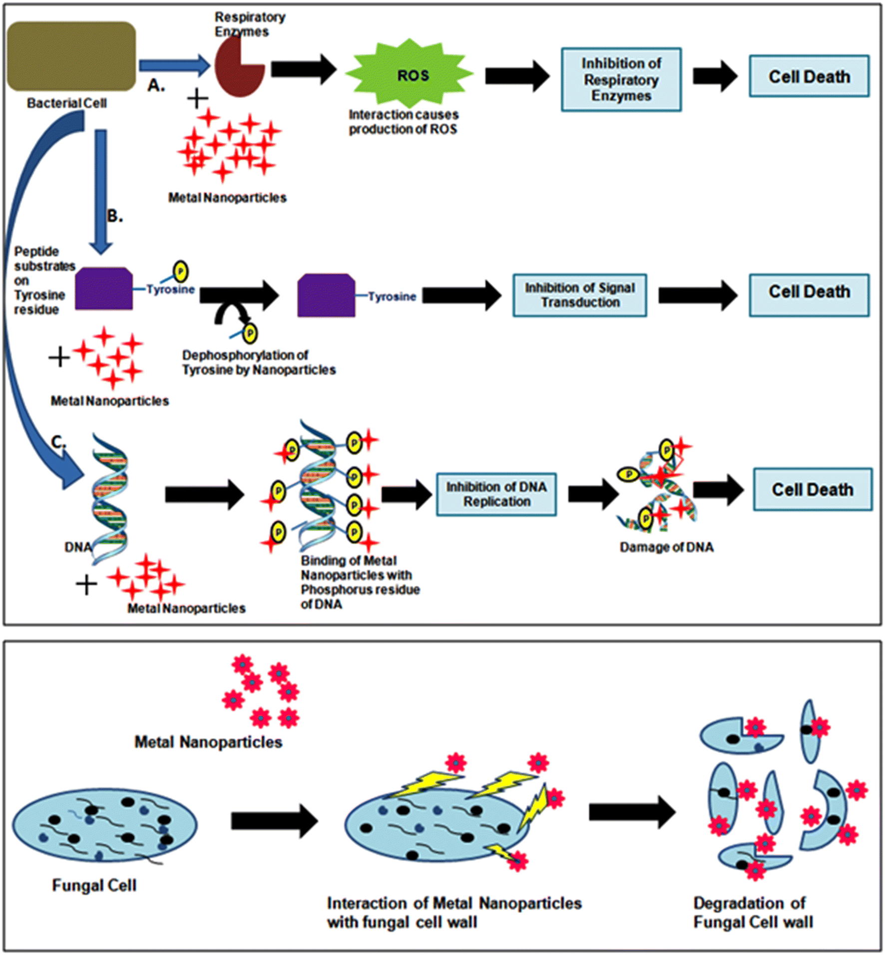 ]. Another report leads to the fact that nanoparticles can regulate the signal transduction process in bacteria. In bacteria, signal transduction process is induced due to phosphorylation of protein substrates. It has been found that the nanoparticles alter the phosphorylation of peptides in bacteria. They dephosphorylate the peptides of tyrosine residue which causes the hindrance of signal transduction and thus leads to death of microbes [