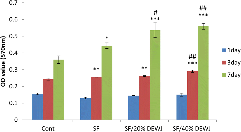 ). The cells influenced by SF/40%DEWJ hydrogel on day 3 and the cells influenced by SF/20%DEWJ and SF/40%DEWJ hydrogels on day 7 indicated a significant increased population than either control or pure SF hydrogel.